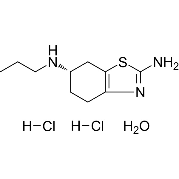 Pramipexolo dicloridrato monoidrato (CAS: 191217-81-9) è un antistaminico. Viene utilizzato principalmente clinicamente per trattare la malattia di Parkinson e la sua sindrome. Può essere usato da solo o in combinazione con Levodopa. Pramipexolo dicloridrato monoidrato è un agonista selettivo e penetrante della barriera ematoencefalica (BBB) del recettore della dopamina di tipo D2-, con Kis di 2,2 nM, 3,9 nM, 0,5 nM e 1,3 nM per il recettore di tipo D2-, i recettori D2, D3 e D4, rispettivamente. Pramipexolo dicloridrato idrato può essere utilizzato per la ricerca sul morbo di Parkinson (PD) e sulla sindrome delle gambe senza riposo (RLS).