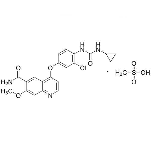 Lenvatinib mesilato (CAS: 857890-39-2) è un inibitore orale e multi-mirato di VEGFR1-3, FGFR1-4, PDGFR, KIT e RET, con potenti attività antitumorali. Lenvatinib mesilato è un inibitore del recettore tirosina chinasi (RTK) dotato di selettività per VEGFR2. Presenta attività antineoplastica ed è stato indicato per il trattamento di pazienti con carcinoma differenziato della tiroide differenziato con iodio radioattivo (RAI) localmente ricorrente o metastatico, progressivo. Lenvatinib mesilato è stato approvato per la prima volta dalla Food and Drug Administration (FDA) statunitense il 13 febbraio 2015, poi approvato dalla Pharmaceuticals and Medical Devices Agency of Japan (PMDA) il 26 marzo 2015 e approvato dall'Agenzia europea per i medicinali (EMA) il 28 maggio 2015. È stato sviluppato e commercializzato come Lenvima® da Eisai. Lenvatinib mesilato è un inibitore orale della tirosin chinasi su più recettori con una modalità di legame unica che inibisce selettivamente le attività chinasiche dei recettori del fattore di crescita endoteliale vascolare (VEGF), oltre ad altre tirosin chinasi correlate al percorso proangiogenico e oncogenico che si ritiene siano coinvolte nella proliferazione tumorale. È indicato per il trattamento del cancro differenziato progressivo della tiroide allo iodio radioattivo-refrattario. Lenvima è utilizzato da solo per il trattamento del cancro differenziato della tiroide (DTC), un tipo di cancro della tiroide che non può più essere trattato con iodio radioattivo e che sta progredendo. LENVIMA è usato insieme a un altro medicinale chiamato everolimus per trattare gli adulti affetti da un tipo di cancro del rene chiamato carcinoma a cellule renali avanzato (RCC) dopo un ciclo di trattamento con un altro medicinale antitumorale.