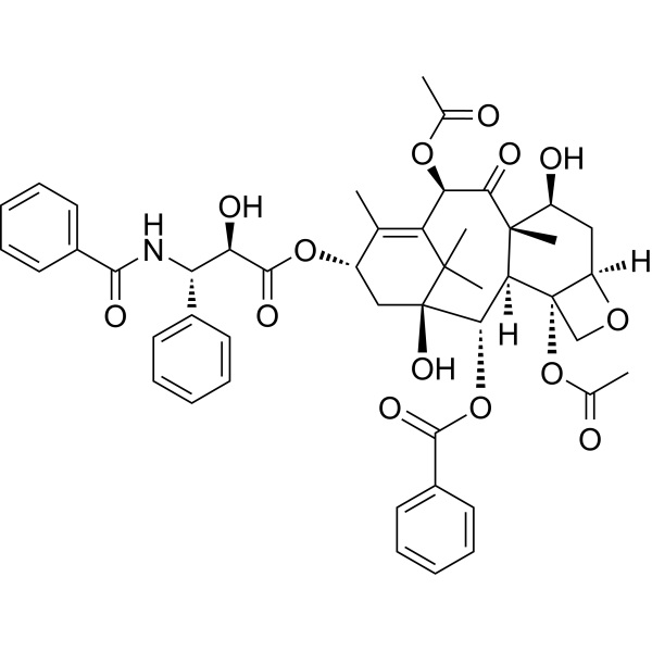 Paclitaxel (Taxolo) (CAS: 33069-62-4) è un composto organico altamente complesso isolato dalla corteccia dell'albero di tasso del Pacifico. Si lega ai dimeri di tubulina e ai filamenti di microtubulina, favorendo l'assemblaggio dei filamenti e impedendone la depolimerizzazione. Questo aumento della stabilità dei microfilamenti provoca l’interruzione della mitosi e della citotossicità e interrompe altre normali funzioni microtubulari, come il trasporto assonale nelle fibre nervose. Il principale meccanismo di resistenza identificato per il paclitaxel è il trasporto fuori dalle cellule tumorali, che porta a una diminuzione dell’accumulo intracellulare del farmaco. Questa forma di resistenza è mediata dal trasportatore multifarmaco P-glicoproteina.
